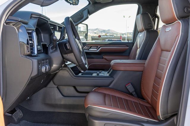 10-Speed Automatic, 4WD, Alpine Umber Leather. Gooseneck/5th Wheel Prep Package, Preferred Equipment Group 5SB (120-Volt Bed Mounted Power Outlet, 120-Volt Instrument Panel Power Outlet, 2 Charge-Only Rear USB Ports, 2 Charge/Data USB Ports Inside Center Console, 2 USB Ports, 2-Speed Active Transfer Case, Bed View Camera with Two Trailer Camera Provisions, Bose Premium Series 12-Speaker System, Deep-Tinted Glass, Electric Rear-Window Defogger, Floor-Mounted Center Console, Front Rain-Sensing Wipers, HD Surround Vision, Heated 2nd Row Outboard Seats, Heated Driver and Front Outboard Passenger Seats, Hitch Guidance with Hitch View, in-Vehicle Trailering App, Keyless Open and Start, LED Cargo Area Lighting, LED Smoked Amber Roof Marker Lamps, Manual Tilt-Wheel/Telescoping Steering Column, Power Front Windows with Passenger Express Up/Down, Power Sliding Rear Window with Defogger, Power Sunroof, ProGrade Trailering System, Push Button Start, Rear Cross Traffic Alert, Remote Vehicle Starter System, Safety Alert Seat, Signature Denali Ultimate Grille in Vader Chrome, SiriusXM with 360L Trial Subscription, Spray-on Pickup Bedliner with GMC Logo, Steering Wheel Audio Controls, Trailer Camera Provisions, Trailer Side Blind Zone Alert, Trailer Tire Pressure Monitor Sensors, Ultrasonic Front and Rear Park Assist, Unauthorized Entry Theft-Deterrent System, Universal Home Remote, Ventilated Driver and Front Passenger Seats, Wireless Charging, and Wireless Phone Projection), Technology Package (Auto-Dimming Inside Rearview Mirror with Camera and Multicolor 15 Diagonal Head-Up Display), 10-Speed Automatic, 4WD, Alpine Umber Leather, 12 Speakers, 16-Way Power Driver Seat Adjuster with Lumbar, 16-Way Power Passenger Seat Adjuster with Lumbar, 220 Amp Alternator, 3.42 Rear Axle Ratio, 4-Wheel Disc Brakes, ABS brakes, Air Conditioning, Alloy wheels, AM/FM radio: SiriusXM with 360L, Auto High-beam Headlights, Auto-dimming door mirrors, Auto-dimming Rear-View mirror, Automatic Emergency Braking, Automatic temperature control, Block heater, Brake assist, Buckle to Drive, Bumpers: body-color, Compass, Delay-off headlights, Driver door bin, Driver Memory, Driver vanity mirror, Dual front impact airbags, Dual front side impact airbags, Dual Heavy-Duty 70 Amp-Hour Battery, Electronic Stability Control, Emergency communication system: OnStar Services capable, Exterior Parking Camera Rear, Following Distance Indicator, Forward Collision Alert, Front anti-roll bar, Front Bucket Seats, Front Center Armrest, Front dual zone A/C, Front fog lights, Front License Plate Kit, Front Pedestrian Braking, Front reading lights, Front wheel independent suspension, Full Grain Leather Seat Trim, Fully automatic headlights, Garage door transmitter, Genuine wood dashboard insert, Genuine wood door panel insert, GMC Premium 13.4 Diagonal Information Display, Heads-Up Display, Heated door mirrors, Heated front seats, Heated rear seats, Heated steering wheel, Illuminated entry, IntelliBeam Automatic High Beam on/Off, Lane Departure Warning System, Leather steering wheel, Low tire pressure warning, Memory seat, Occupant sensing airbag, Outside temperature display, Overhead airbag, Overhead console, Panic alarm, Passenger door bin, Passenger vanity mirror, Pickup Bed, Power door mirrors, Power driver seat, Power moonroof, Power passenger seat, Power steering, Power windows, Premium audio system: Premium GMC Infotainment System, Radio: AM/FM Stereo with Premium GMC Infotainment System, Rain sensing wipers, Rear reading lights, Rear seat center armrest, Rear step bumper, Rear window defroster, Remote keyless entry, Security system, Speed control, Speed-sensing steering, Split folding rear seat, Steering wheel mounted audio controls, Tachometer, Telescoping steering wheel, Tilt steering wheel, Traction control