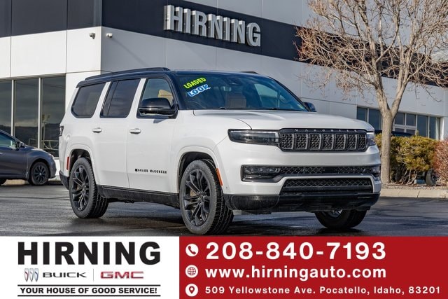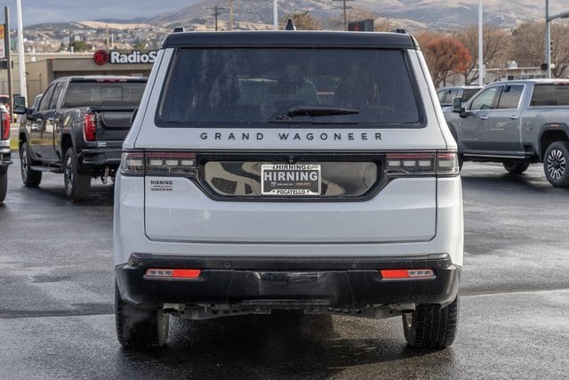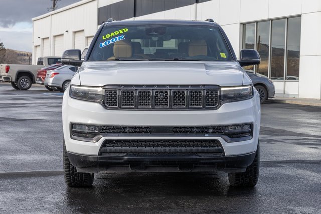 MOPAR Interior Protection Package (All-Season Floor Mats and Cargo Tray), Obsidian Appearance Package, Quick Order Package 28T Obsidian (Black Interior Accents, Black Roof, Gloss Black Upper & Lower DLO Molding, Piano Black Exterior Accents, and Wheels: 22 x 9.0 Tinted Polished w/Black Insert), Rear Seat Video Group 1 (Amazon Fire TV Built-In, Seatback Video Screens, and Video USB Port), Two Tone Paint Group, 3.92 Rear Axle Ratio, 3rd row seats: bench, 4-Wheel Disc Brakes, ABS brakes, Adjustable pedals, Air Conditioning, Alloy wheels, AM/FM radio: SiriusXM with 360L, Anti-whiplash front head restraints, Apple CarPlay/Android Auto, Audio memory, Auto High-beam Headlights, Auto-dimming door mirrors, Auto-dimming Rear-View mirror, Auto-leveling suspension, Automatic temperature control, Brake assist, Bumpers: body-color, Compass, Delay-off headlights, Driver door bin, Driver vanity mirror, Driver's Seat Mounted Armrest, Dual front impact airbags, Dual front side impact airbags, Electronic Stability Control, Emergency communication system: Wagoneer Connect, Four wheel independent suspension, Front anti-roll bar, Front Bucket Seats, Front Center Armrest w/Storage, Front dual zone A/C, Front fog lights, Front reading lights, Fully automatic headlights, Garage door transmitter, Genuine wood console insert, Genuine wood dashboard insert, Genuine wood door panel insert, Heads-Up Display, Heated door mirrors, Heated front seats, Heated rear seats, Heated steering wheel, Illuminated entry, Knee airbag, Leather steering wheel, Low tire pressure warning, Memory seat, Navigation System, Night vision lights, Normal Duty Suspension, Occupant sensing airbag, Outside temperature display, Overhead airbag, Overhead console, Panic alarm, Passenger door bin, Passenger seat mounted armrest, Passenger vanity mirror, Pedal memory, Power adjustable front head restraints, Power door mirrors, Power driver seat, Power Liftgate, Power moonroof, Power passenger seat, Power steering, Power windows, Premium Leather Trimmed Bucket Seats, Radio data system, Radio: Uconnect 5 Nav w/12.0 Display, Rain sensing wipers, Rear air conditioning, Rear anti-roll bar, Rear dual zone A/C, Rear reading lights, Rear seat center armrest, Rear window defroster, Rear window wiper, Reclining 3rd row seat, Remote keyless entry, Roof rack, Security system, Speed control, Speed-sensing steering, Speed-Sensitive Wipers, Split folding rear seat, Steering wheel memory, Steering wheel mounted audio controls, Tachometer, Telescoping steering wheel, Tilt steering wheel, Traction control, Trip computer, Turn signal indicator mirrors, Variably intermittent wipers, Ventilated front seats, Ventilated rear seats, Voltmeter, and Wheels: 22 x 9.0 Premium 4 Aluminum.